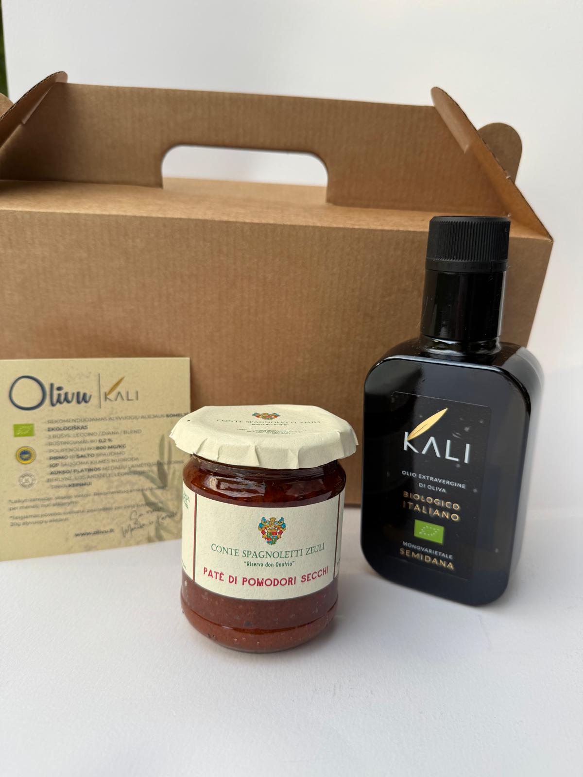 Rinkinį sudaro:250ml aukščiausios kokybės pirmo spaudimo alyvuogių aliejus ir džiovintų pomidorų užtepėlė (arba saulėje džiovinti pomidorai).